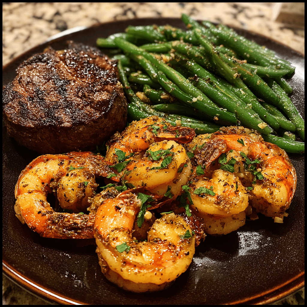 Steak & Garlic Shrimp with Spicy Sautéed Green Beans – A Bold Surf and Turf Dinner