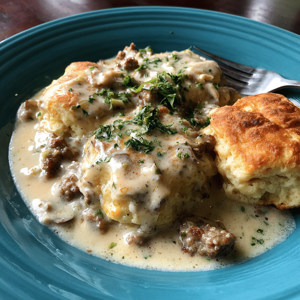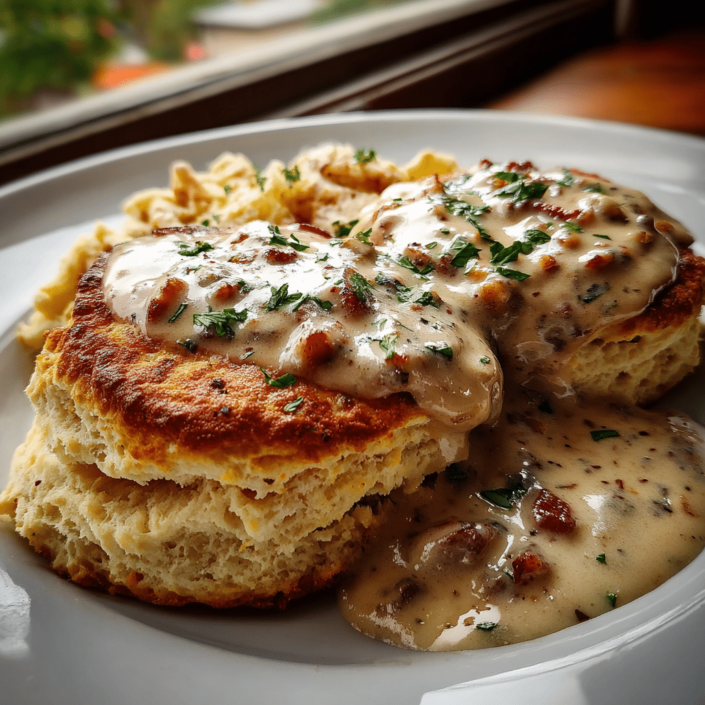 A classic Southern comfort dish featuring warm, flaky biscuits smothered in rich, creamy sausage gravy.