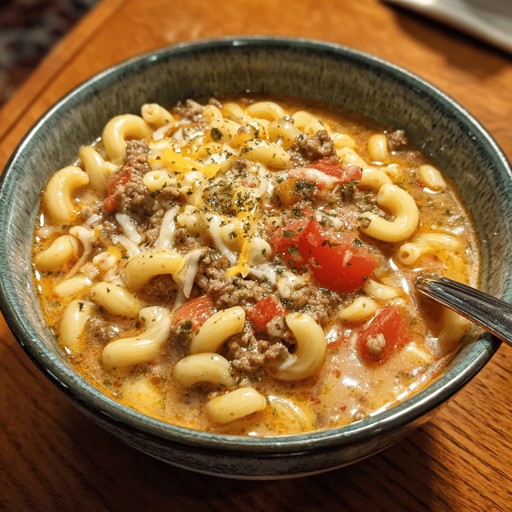 A hearty and comforting soup that combines all the classic flavors of a cheeseburger with tender macaroni in a rich, cheesy broth—perfect for a cozy family meal.