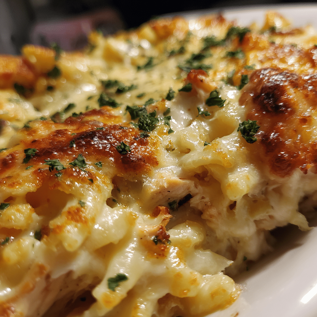 A rich, creamy, and comforting baked chicken Alfredo pasta made with tender chicken, al dente pasta, and a luscious homemade Alfredo sauce. Topped with melted mozzarella and Parmesan, this family-favorite casserole is perfect for cozy dinners or make-ahead meals.