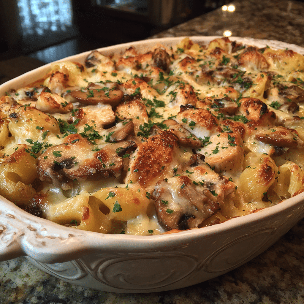 A comforting Cheesy Chicken Marsala Bake featuring tender chicken, mushrooms, a rich Marsala wine sauce, and melted cheese baked to perfection.