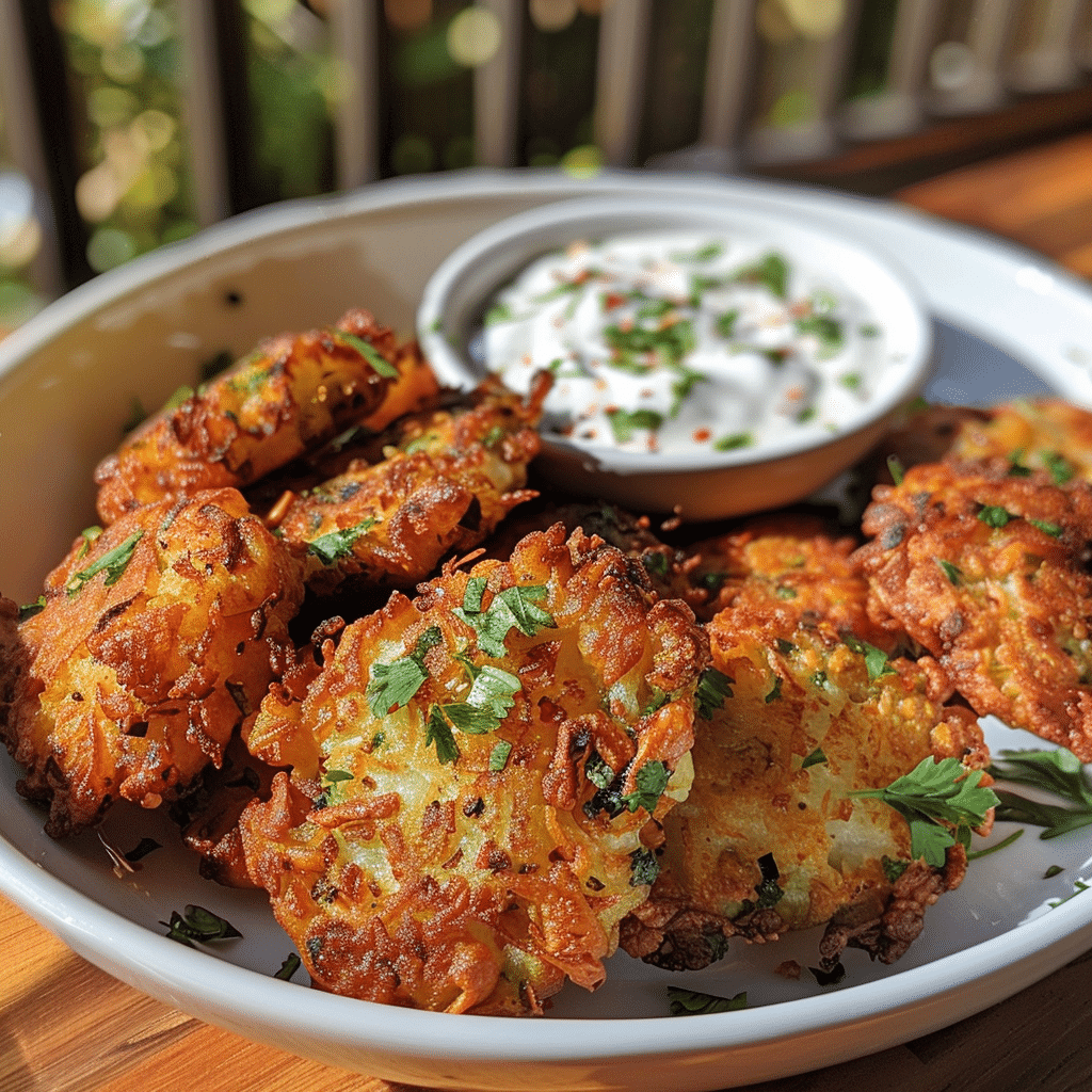 Store leftover fritters in an airtight container in the refrigerator for up to 3 days. Reheat in a 375°F oven or air fryer for 5–7 minutes to restore crispness. The dip can be stored separately in the fridge for up to 5 days.