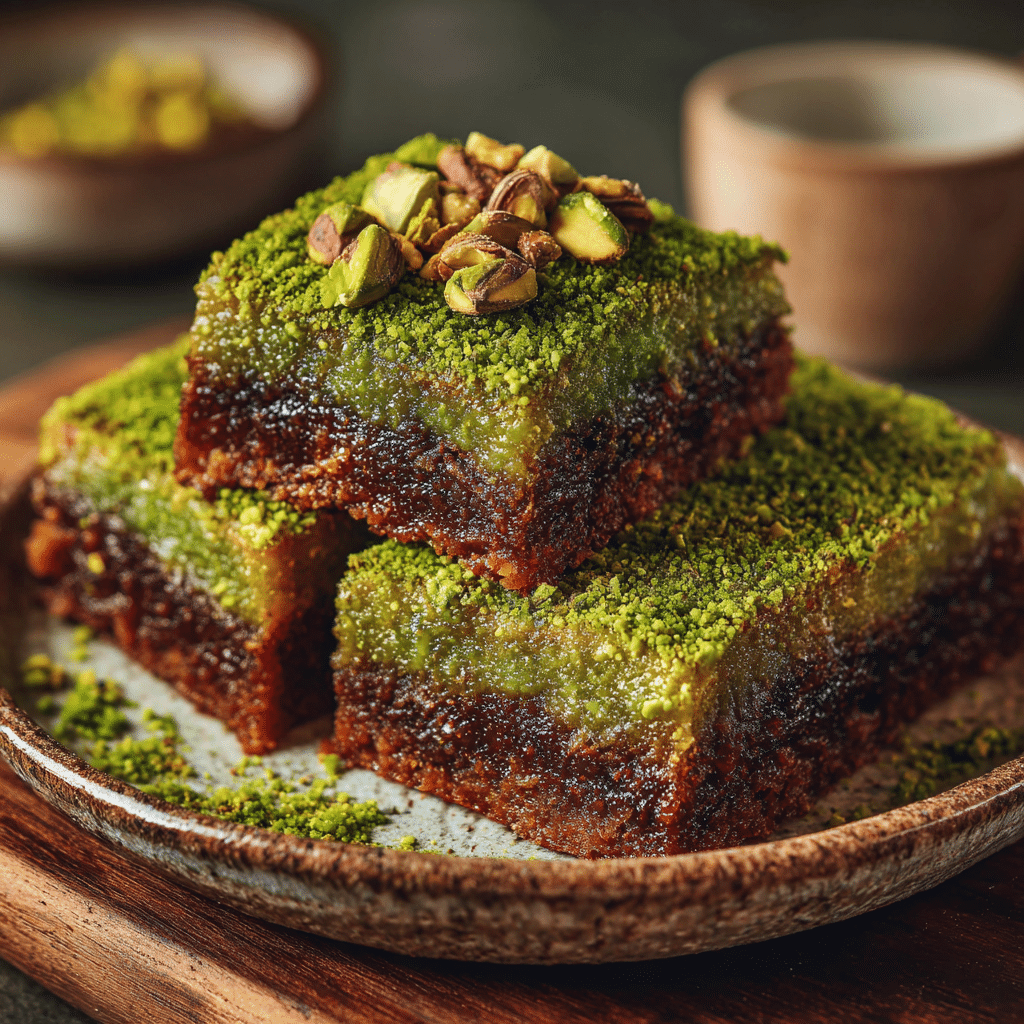 Rich and fudgy brownies layered with crispy kunafa pastry and a luxurious pistachio filling, inspired by the viral Dubai-style dessert combining Middle Eastern flavors with classic brownies.