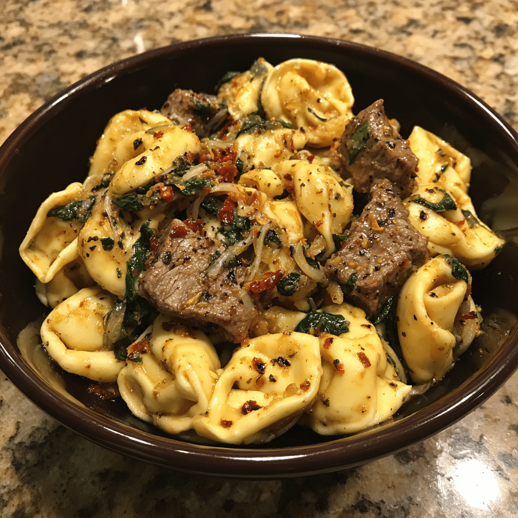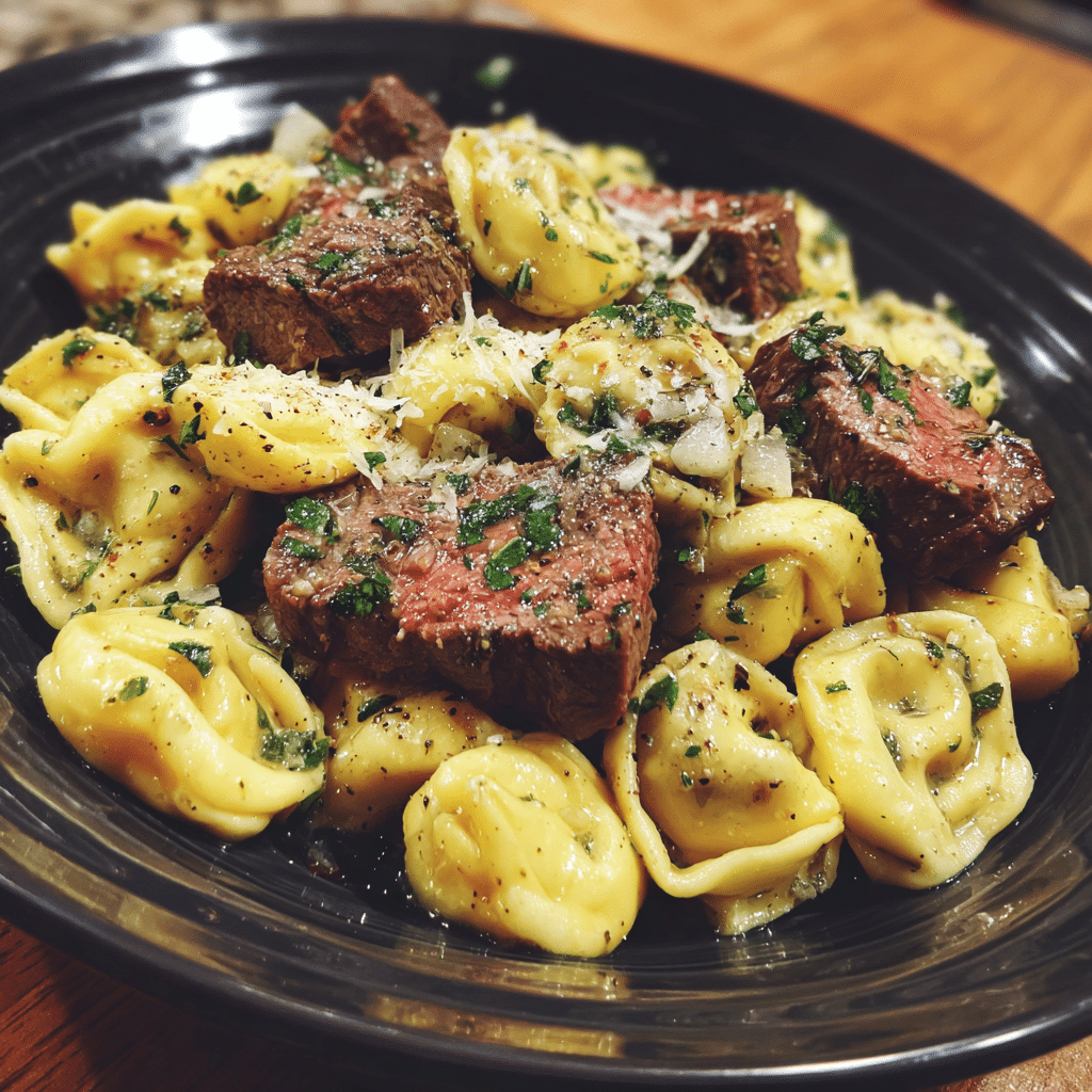Begin by cooking the tortellini according to package instructions until al dente; drain and set aside. While the pasta cooks, slice the steak into thin strips and season generously with salt, pepper, and Italian seasoning. Heat olive oil in a large skillet over medium-high heat, then sear the steak until browned on the edges but still tender inside. Remove the steak and set it aside. In the same skillet, melt the butter and add the minced garlic, letting it cook just until fragrant. Pour in the beef broth to deglaze the pan, scraping up the browned bits that form the base of the sauce. Add the tortellini to the skillet, stirring to coat each piece with the garlic-butter mixture. Return the cooked steak to the pan, tossing gently until everything is warmed through. Finish with grated Parmesan and a sprinkle of fresh parsley. I once added a splash of cream for extra silkiness, and it worked beautifully.