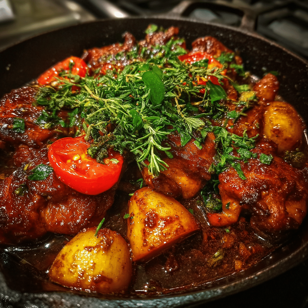 Bring the mixture to a gentle boil, then lower the heat and simmer uncovered for 30 minutes. Add the potatoes and continue simmering for another 15–20 minutes, stirring occasionally, until the chicken is tender and the sauce thickens into a glaze.
