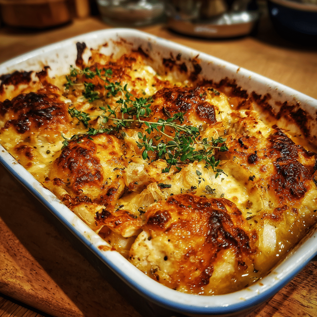A savory French onion–inspired chicken bake featuring caramelized onions, tender chicken breasts, melted cheese, and rich beefy flavors for a comforting dinner.