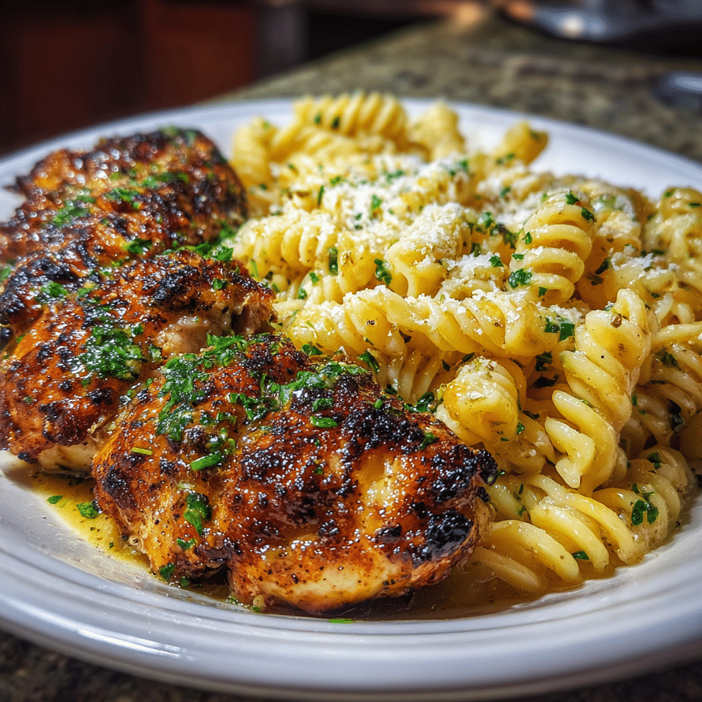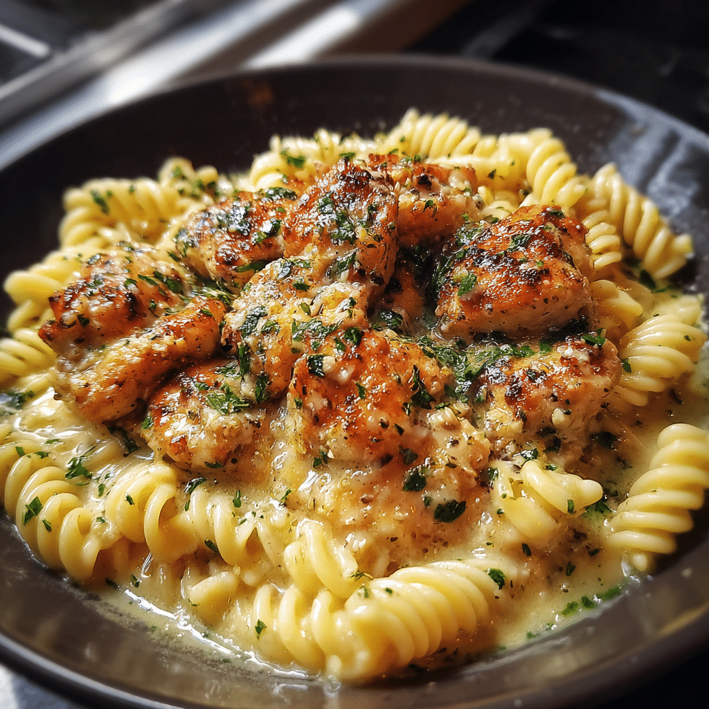A comforting and flavorful pasta dish made with tender garlic butter chicken, rotini pasta, and a rich, creamy Parmesan sauce—perfect for an easy yet satisfying dinner.