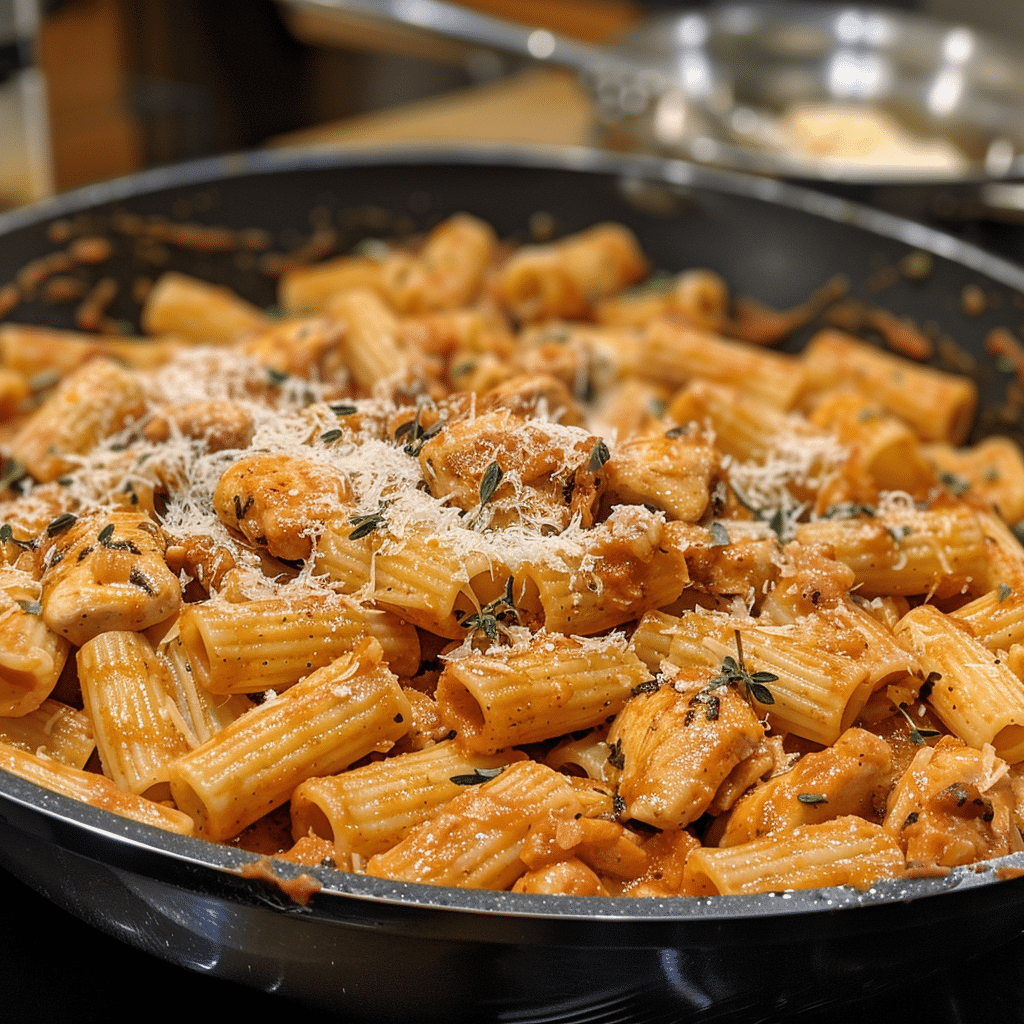 - Combine: Add the cooked rigatoni and seared chicken back into the skillet. Toss everything together until coated in the creamy sauce. Taste and adjust seasoning with salt, pepper, and a splash of lemon juice if desired.