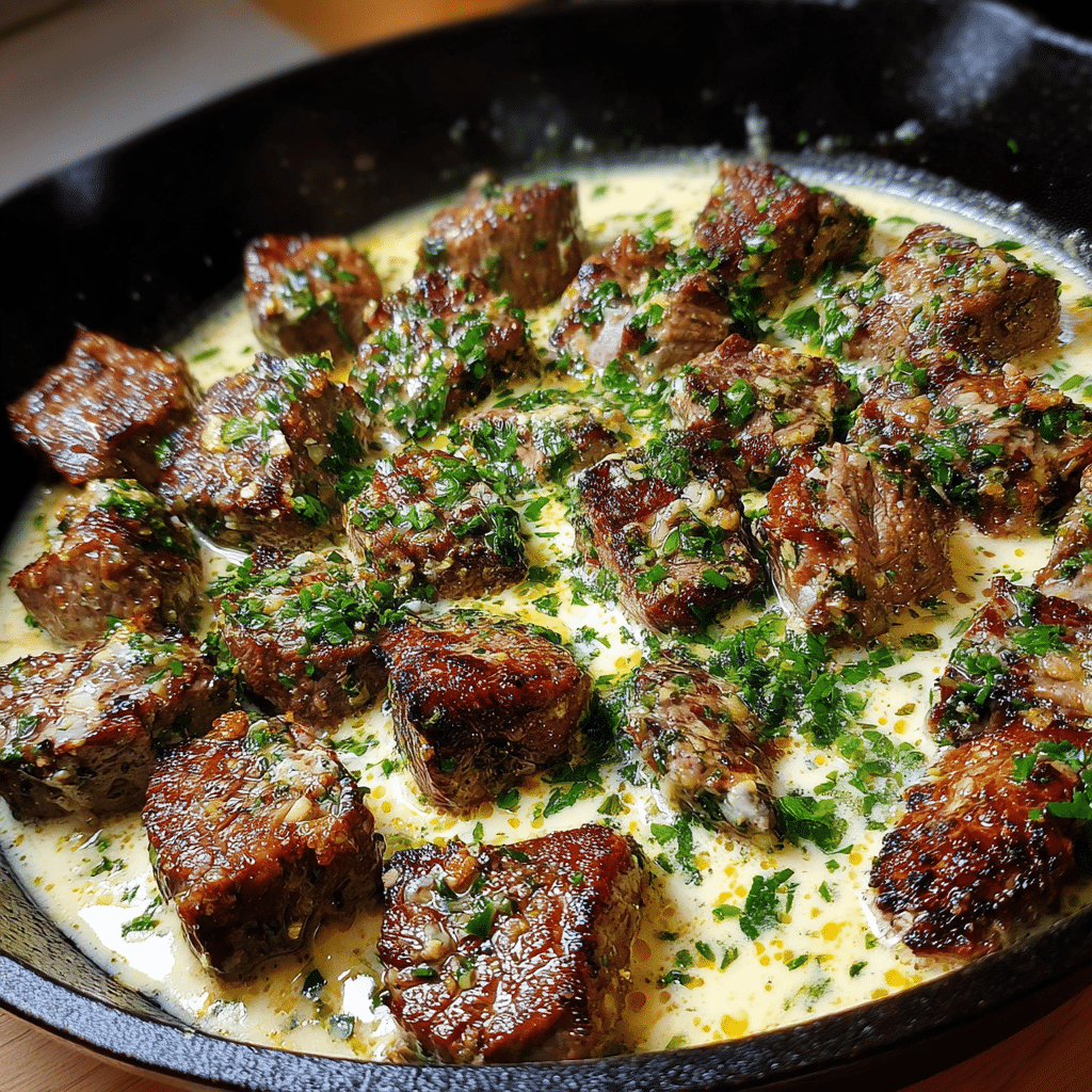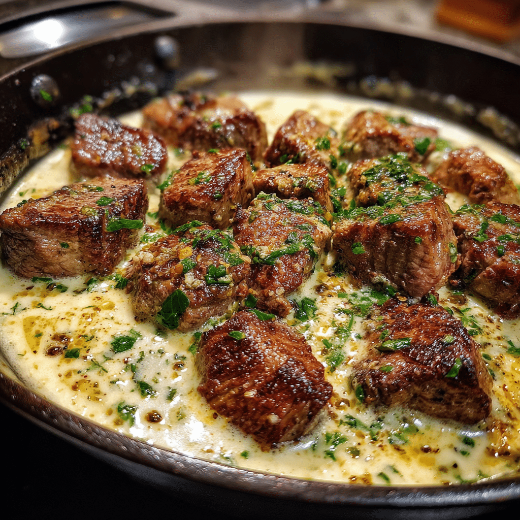 Juicy, tender steak bites seared in garlic butter and served with a rich, velvety Parmesan cream sauce for an indulgent and flavorful meal or appetizer.