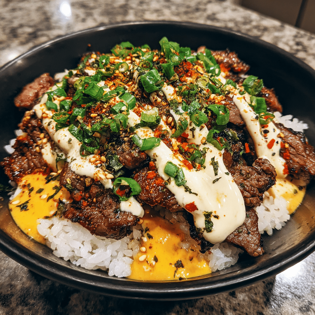 - Top each bowl with grilled beef, drizzle with creamy sauce, and sprinkle with green onions and sesame seeds.