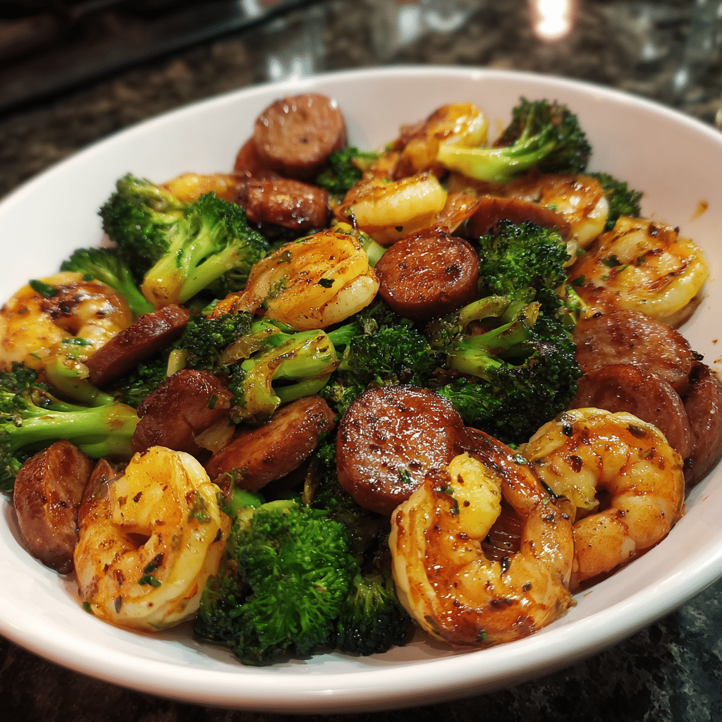 Add the broccoli to the skillet with a splash of water, cover, and steam for 3–4 minutes until tender-crisp. Return the sausage and shrimp to the skillet. Pour the honey garlic sauce over everything and toss until well coated and slightly thickened.