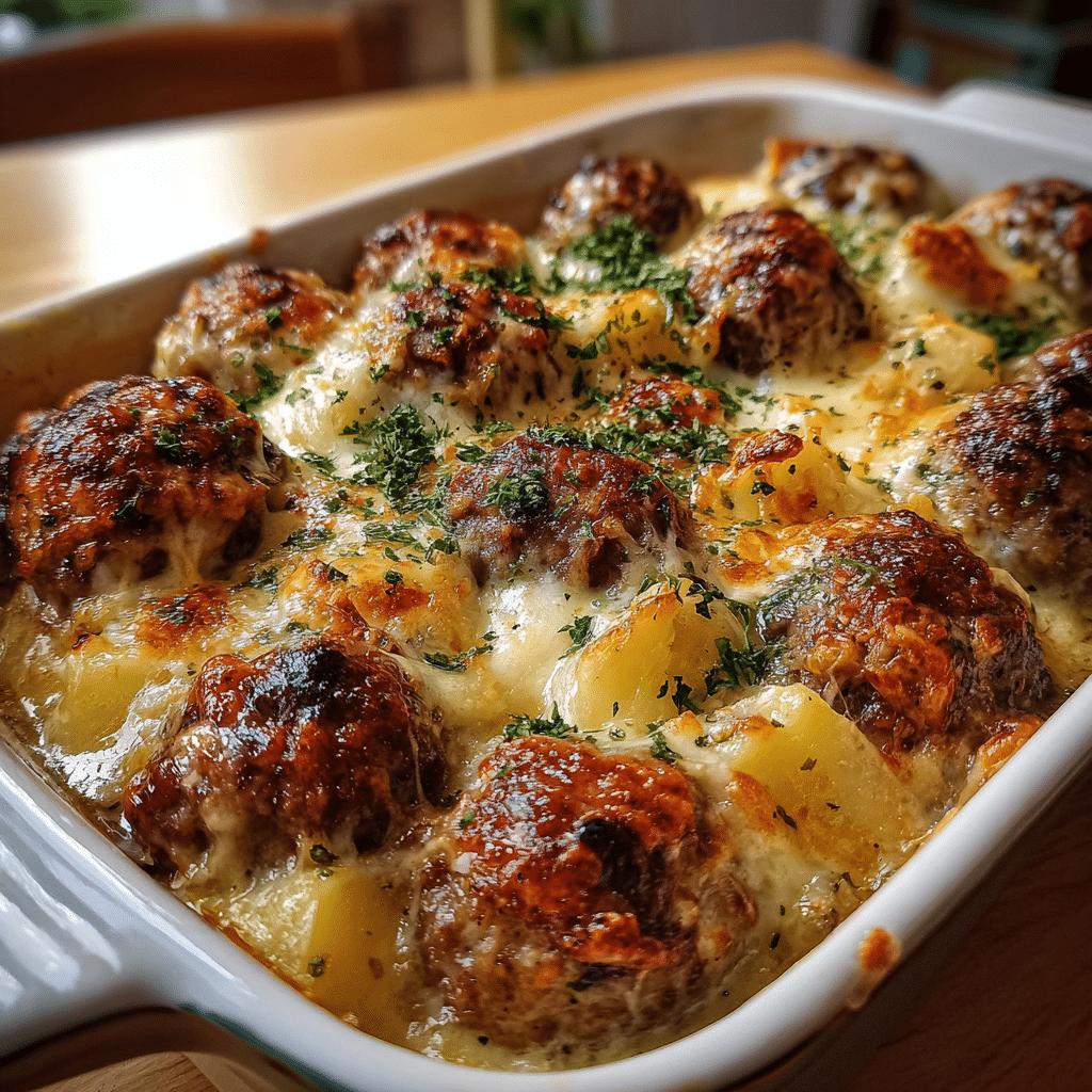When you combine juicy meatballs, creamy potatoes, and gooey cheese, you get the ultimate comfort food. This dish is hearty, satisfying, and perfect for family dinners or weekend gatherings. The meatballs are tender and flavorful, the potatoes bake up soft and buttery, and the melted cheese ties everything together in one delicious casserole-style meal.
