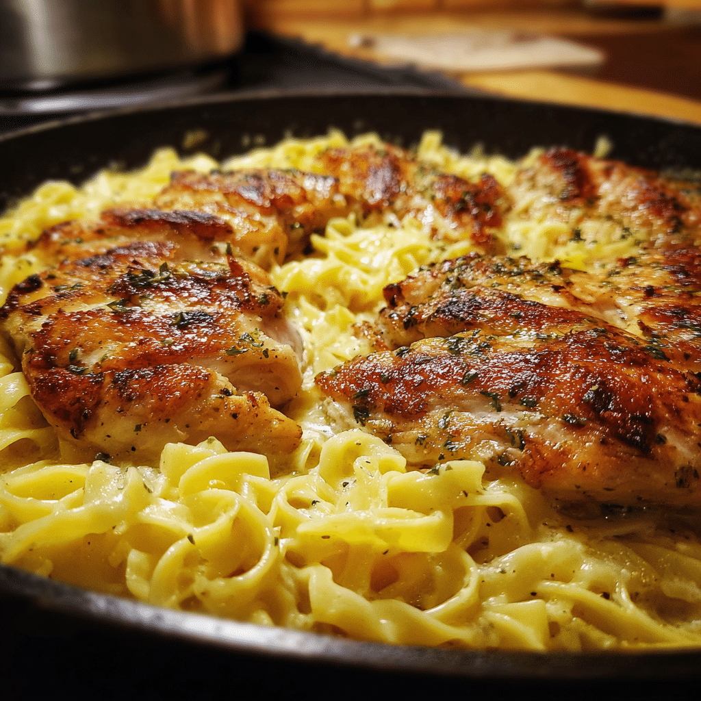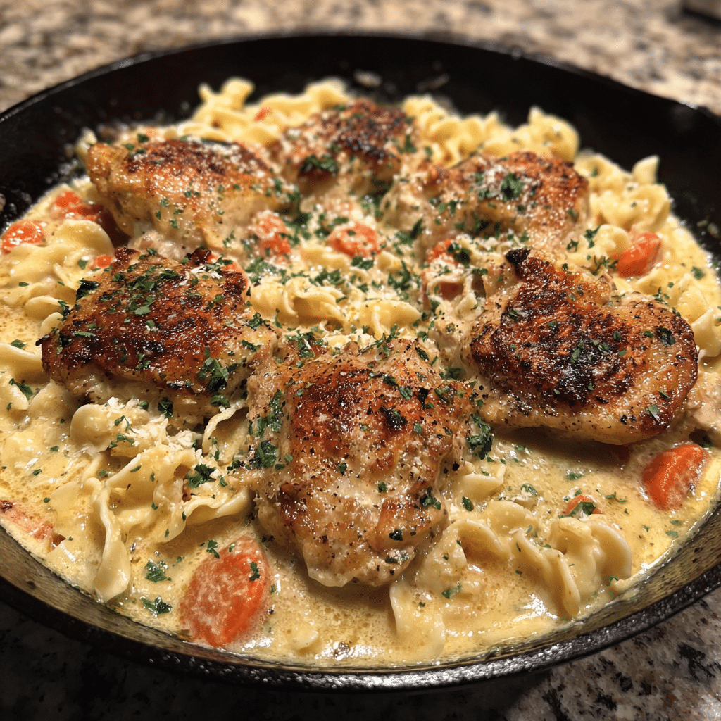 A cozy, family-friendly one-pan meal featuring tender chicken cooked alongside buttery, garlic-infused egg noodles for a simple but delicious weeknight dinner.