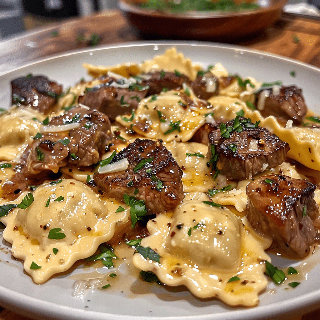 A rich and satisfying one-skillet meal featuring tender garlic butter steak bites tossed with cheesy ravioli in a luscious, buttery sauce. This quick and hearty dinner blends the best of steakhouse flavor and comforting pasta in just 30 minutes.