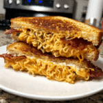 Ramen noodle grilled cheese with bacon takes two beloved comfort foods and fuses them into one unforgettable sandwich. Imagine crispy, buttery bread with gooey melted cheese, smoky bacon, and a layer of seasoned ramen noodles tucked inside—it’s indulgent, playful, and satisfying all at once. This is not your average grilled cheese; it’s a bold upgrade that balances crunch, creaminess, and savory flavors. The first time I made it, I added a sprinkle of the ramen seasoning packet into the noodles before layering, and the result was incredible—cheesy, salty, and slightly nostalgic. Perfect for a weekend lunch, late-night snack, or anytime you’re craving something over-the-top, this sandwich is guaranteed to impress.