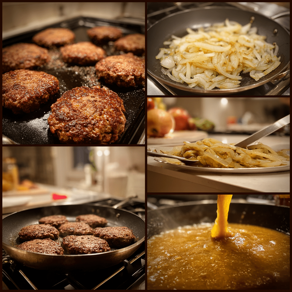 Butter and oil are used for browning the patties and sautéing the onions, adding depth and color.