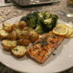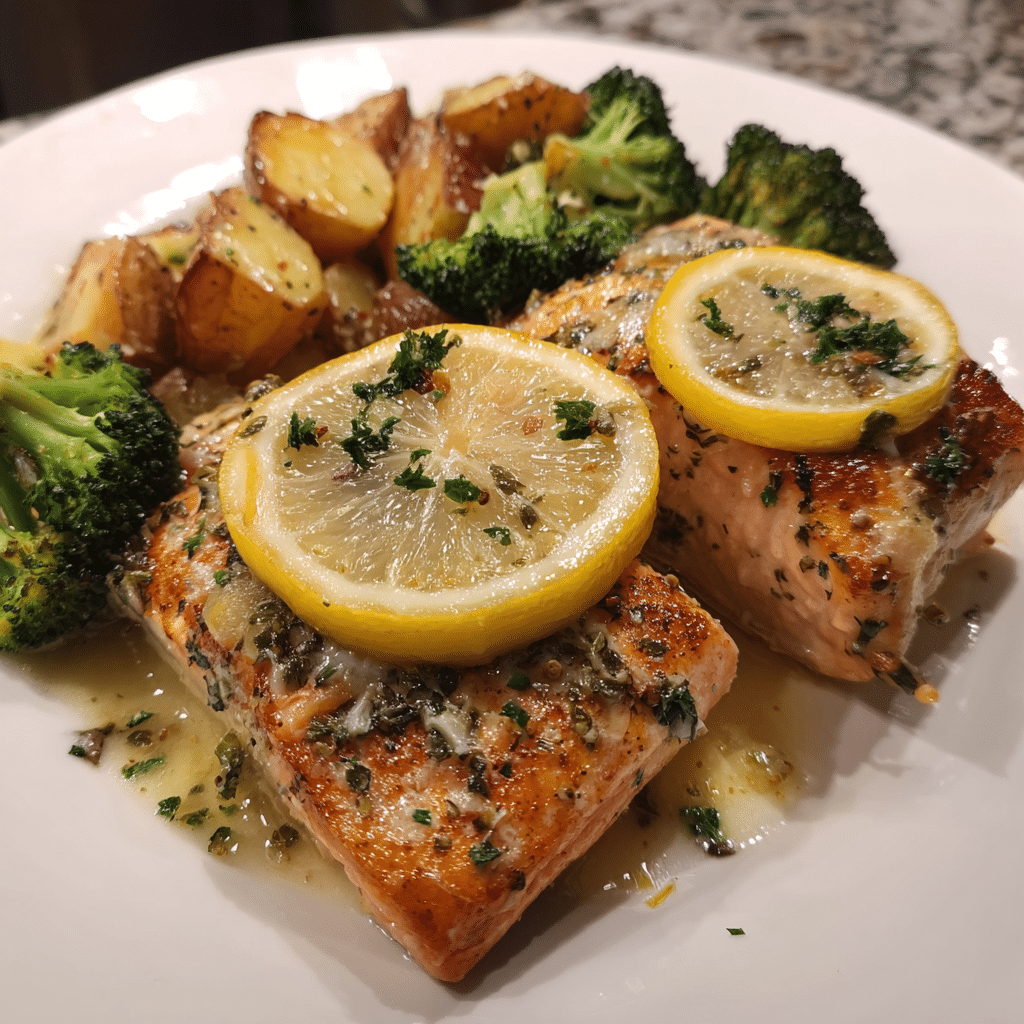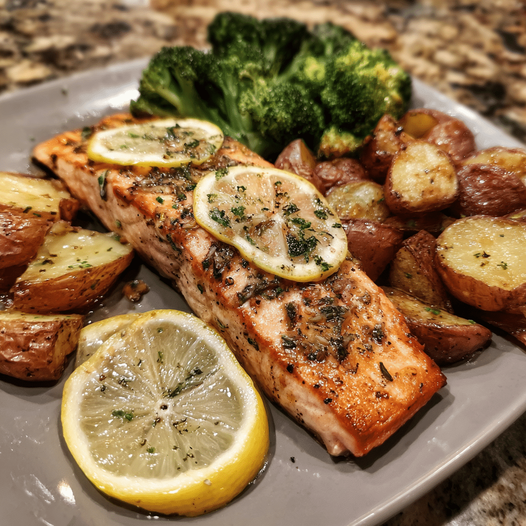 A simple, flavorful meal featuring tender lemon-butter baked salmon served with crispy roasted potatoes and perfectly seasoned broccoli.