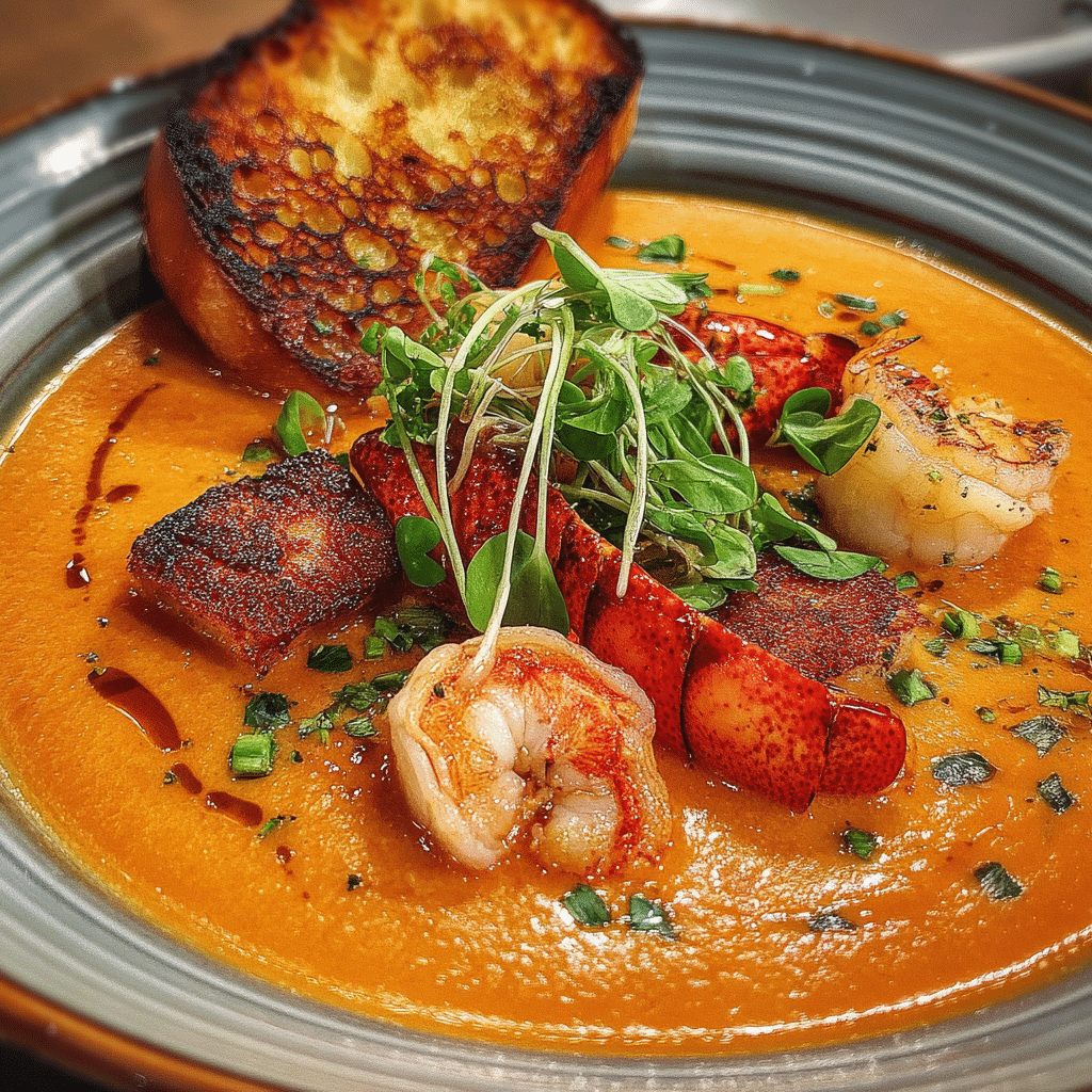 A luxurious and creamy seafood bisque made with tender crab, shrimp, and lobster simmered in a rich, aromatic broth finished with cream for an elegant and comforting soup.