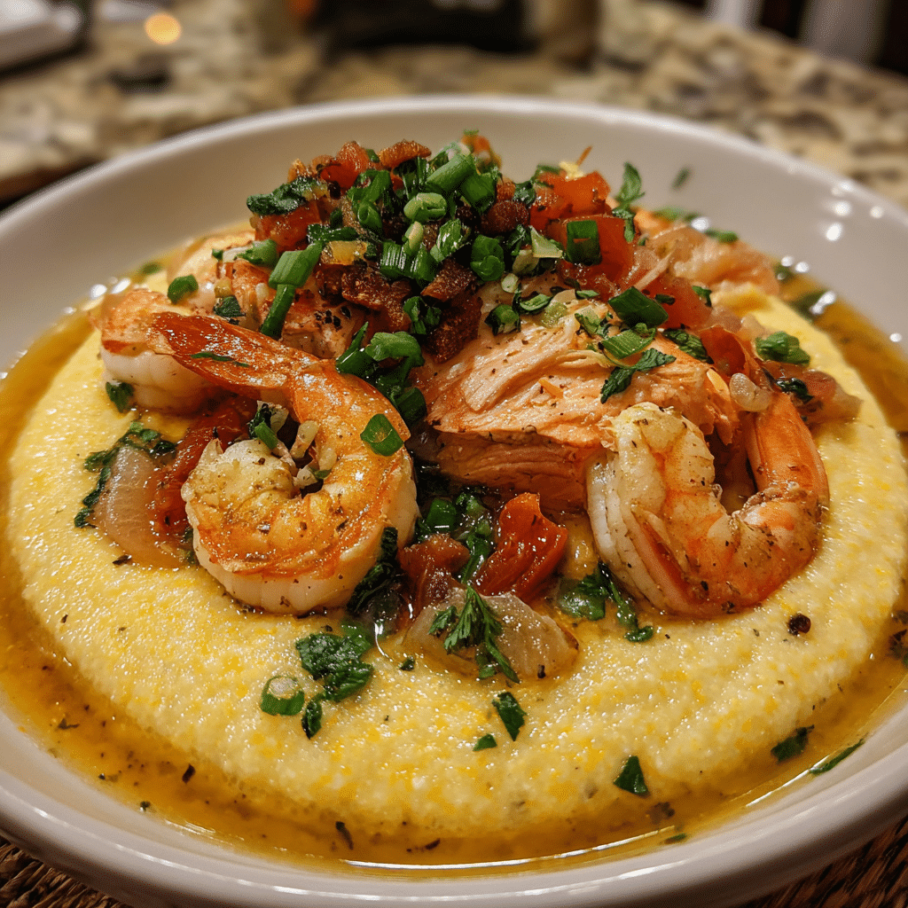 Shrimp and Salmon over Cheesy Grits is a comforting, restaurant-worthy dish that brings together the best of Southern soul food and coastal flavor. Creamy, buttery grits form the perfect base for tender shrimp and flaky salmon, all coated in a rich, savory sauce that ties everything together. It’s luxurious yet simple — a dish that feels indulgent without being overly complicated. I tried this recipe using smoked gouda for the grits and a touch of Cajun seasoning on the seafood, and it turned out absolutely irresistible. Each bite is a perfect harmony of creamy, cheesy, and smoky flavors that make this meal ideal for Sunday brunches, special dinners, or any time you want to impress.