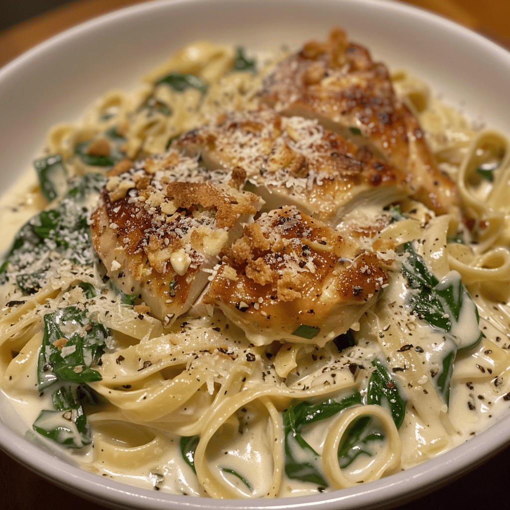 A luxurious and flavorful pasta dish that combines tender chicken, creamy Alfredo sauce, spinach, artichokes, and a crispy Parmesan topping — a restaurant-quality comfort meal made easily at home.