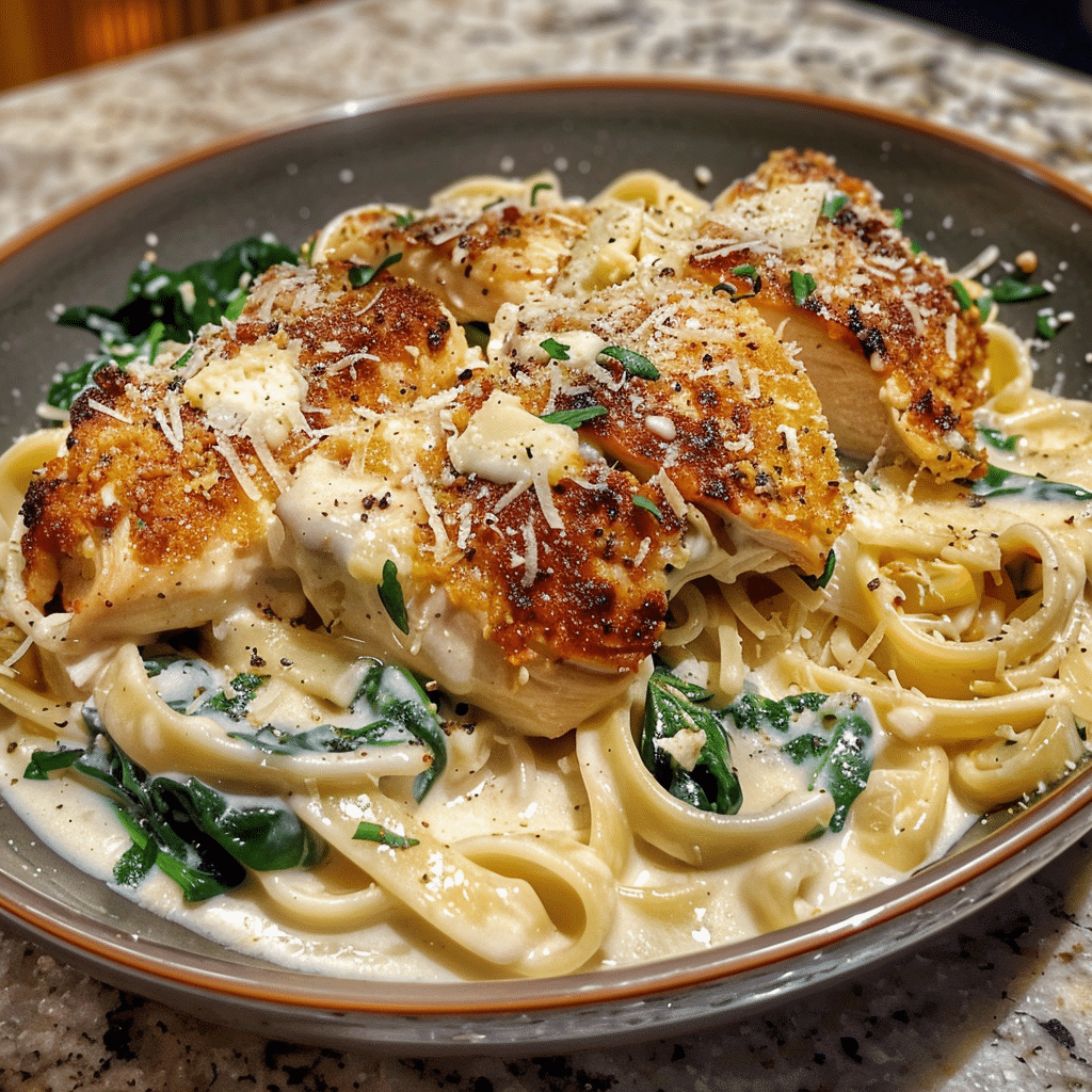 Spinach-Artichoke Garlic Chicken Alfredo with Crispy Parmesan is the ultimate comfort meal that blends creamy, cheesy indulgence with a touch of elegance. Each bite combines tender chicken, silky sauce, and that irresistible crunch of Parmesan topping. Whether for a cozy night in or an impressive dinner for guests, this dish promises to satisfy every craving for rich, comforting flavor with a sophisticated twist.