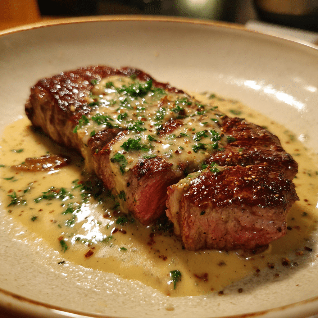 A tender, pan-seared steak served with a luxurious garlic cream sauce that is rich, savory, and perfect for a comforting yet elegant meal.