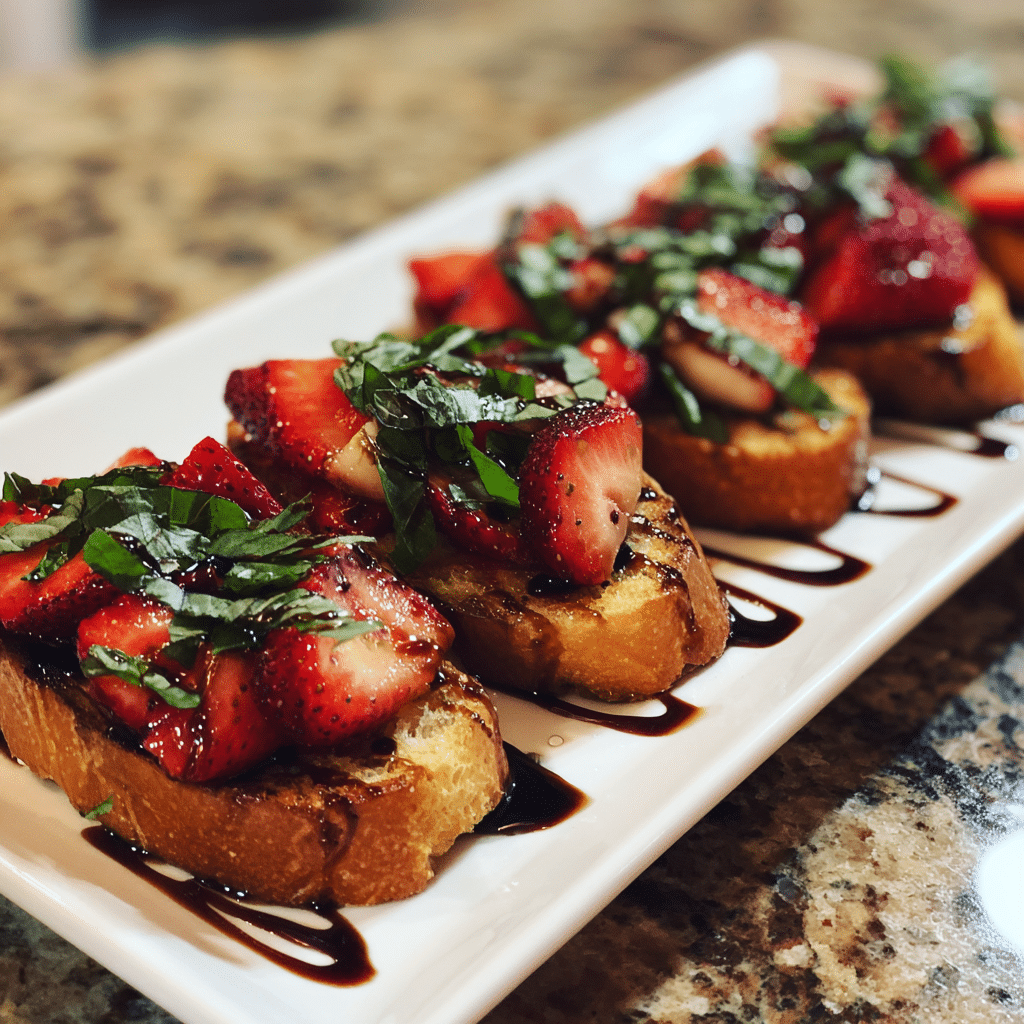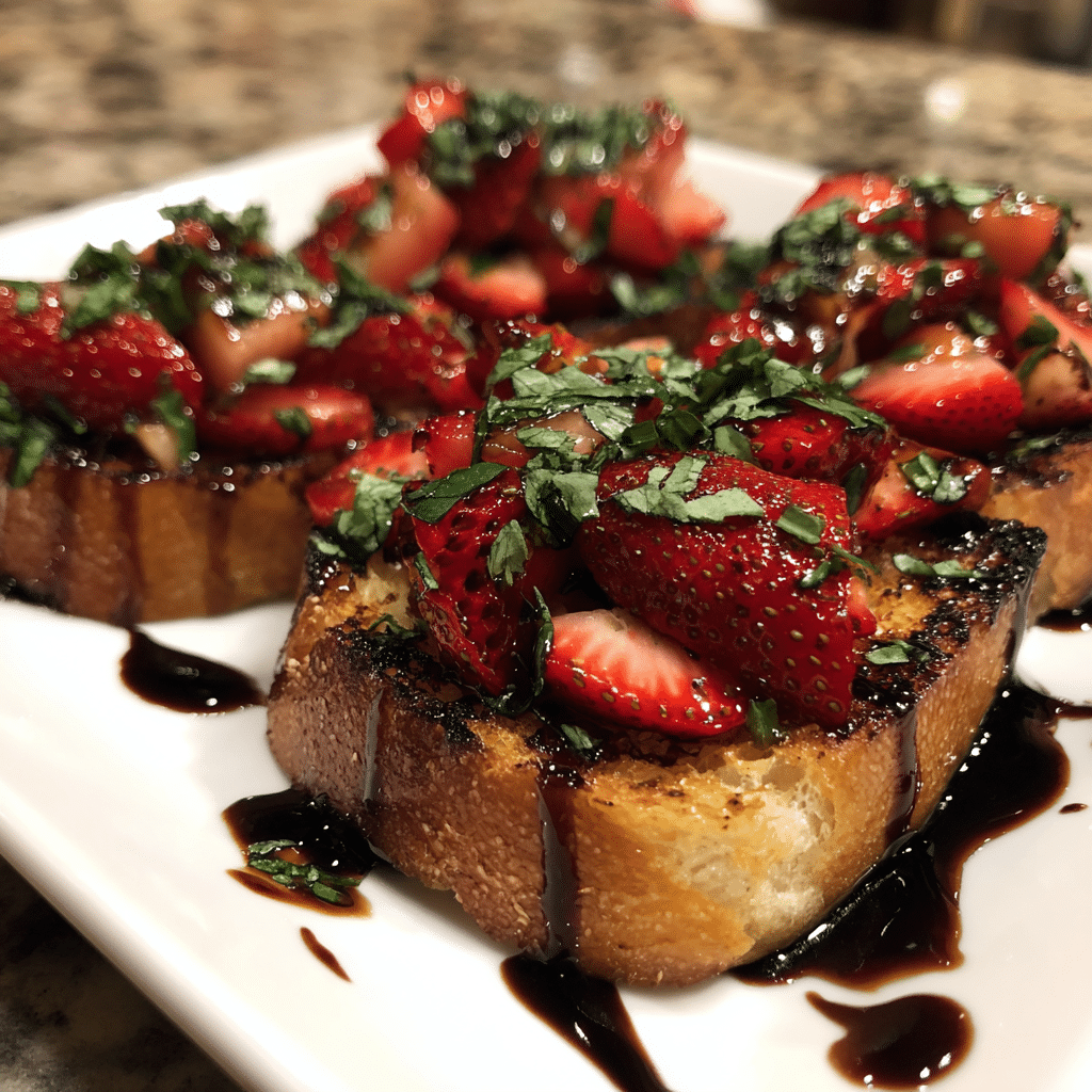A refreshing twist on classic bruschetta featuring sweet strawberries, fresh basil, and a tangy balsamic glaze served on crisp toasted baguette slices. This elegant appetizer perfectly balances sweet, savory, and tangy flavors for a light spring or summer bite.