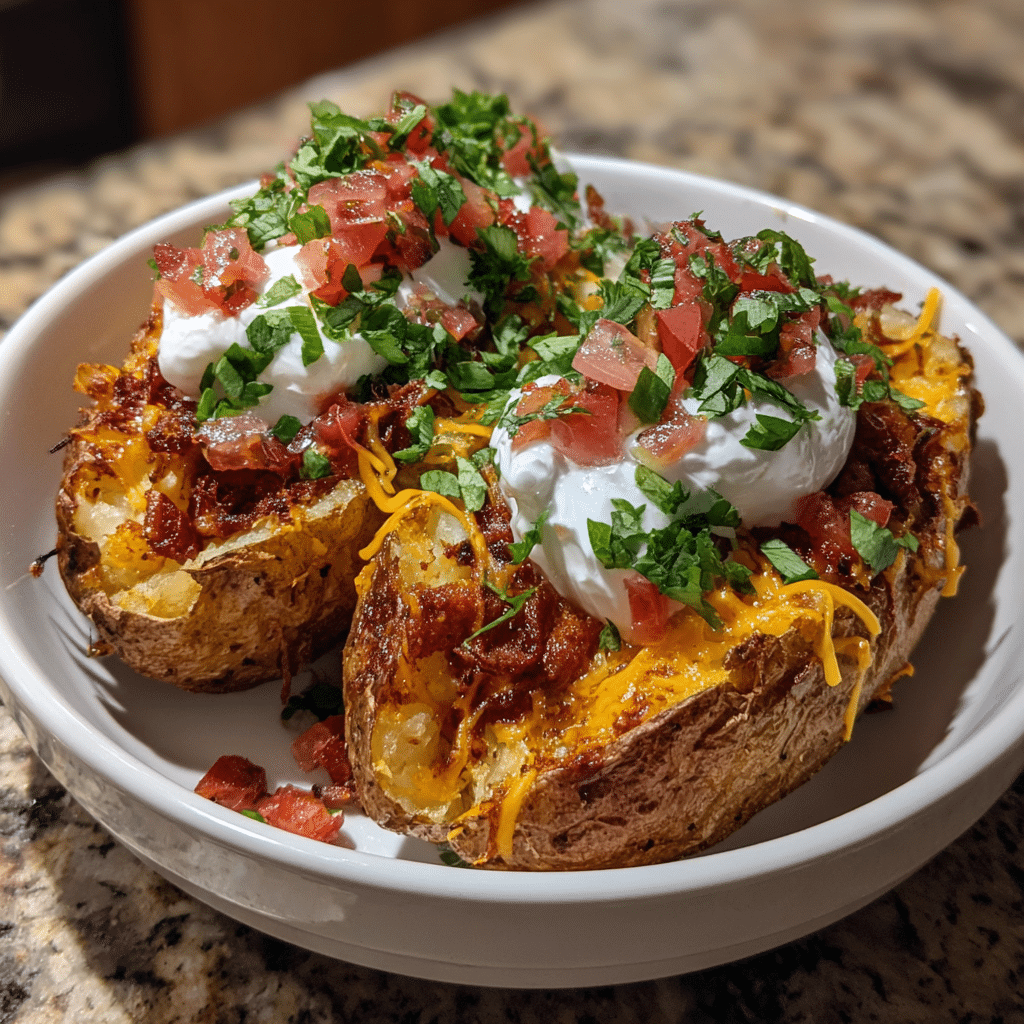 Begin by baking the potatoes. Preheat the oven to 400°F, scrub the potatoes, prick them with a fork, and bake for about 50–60 minutes, or until fork-tender.
